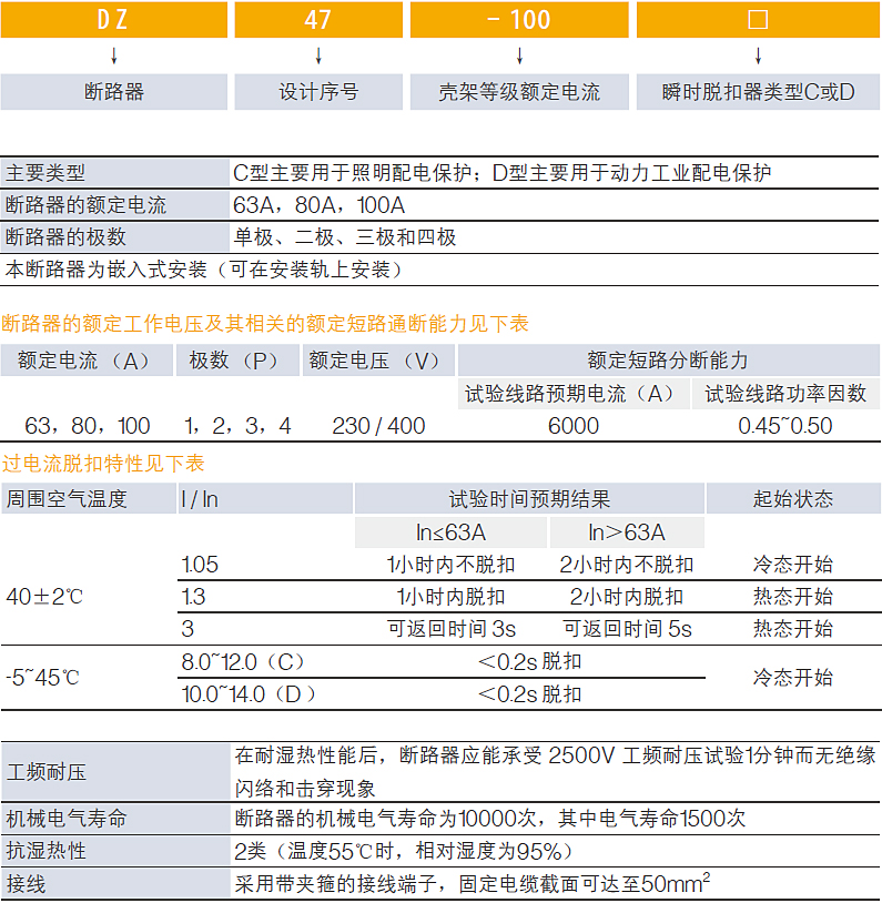 DZ47-100高分断小型断路器用于保护线路的短路和过载,适用于照明配电系统和电动机的配电系统。外型美观小巧、重量轻,性能优良可靠,分断能力较高,脱扣迅速,导轨安装,壳体和部件采用高阻燃及耐冲击塑料,使用寿命长,主要用于交流 50Hz或60Hz,单极230V,二极、三极、四极400V线路的过载、短路保护,同时也可以在正常情况下不频繁地通断电器装置和照明线路。可加装欠电压脱扣器,分励脱扣器等附件,也适用于隔离开关及作为线路的欠电压保护和远距离断开之用。